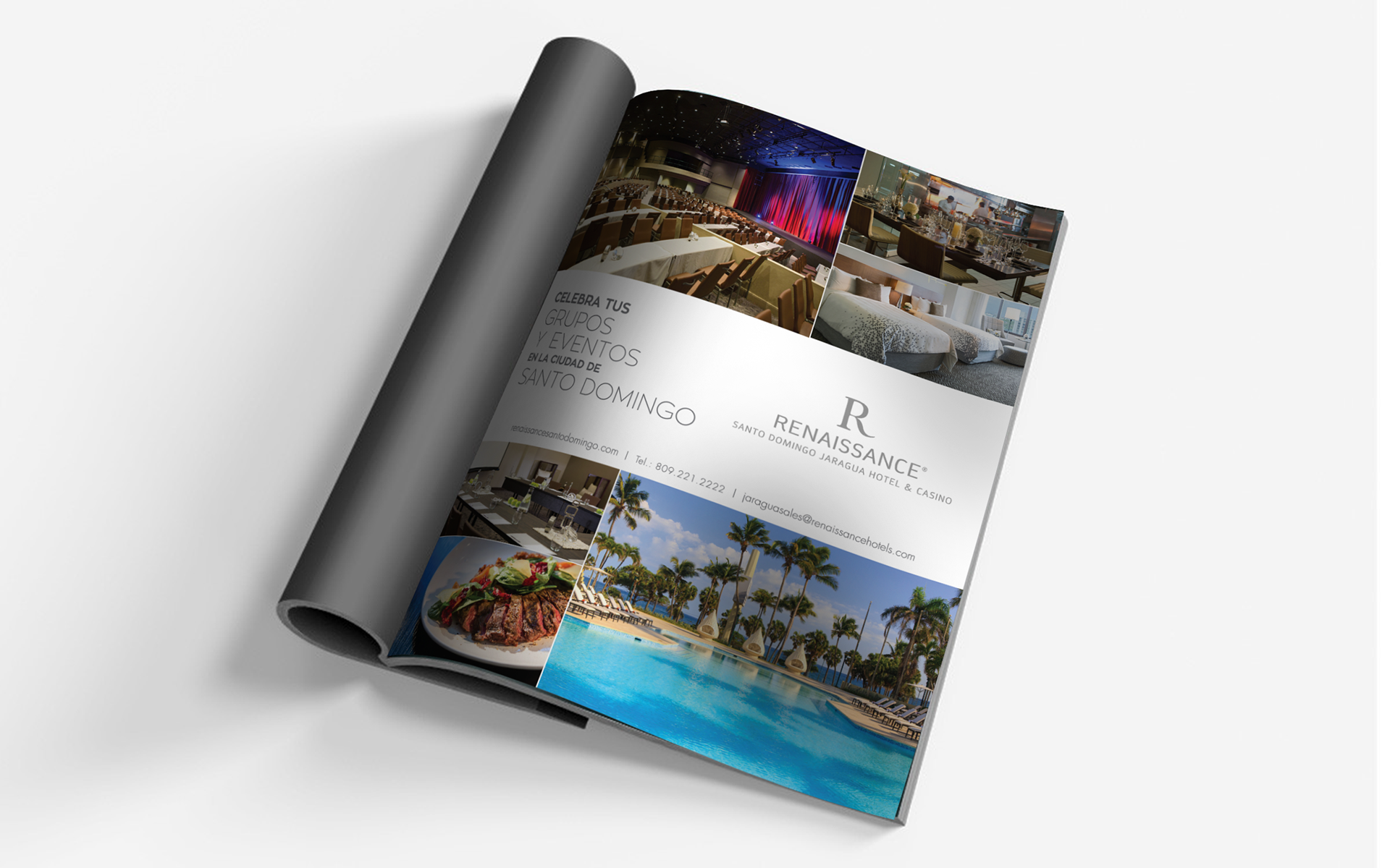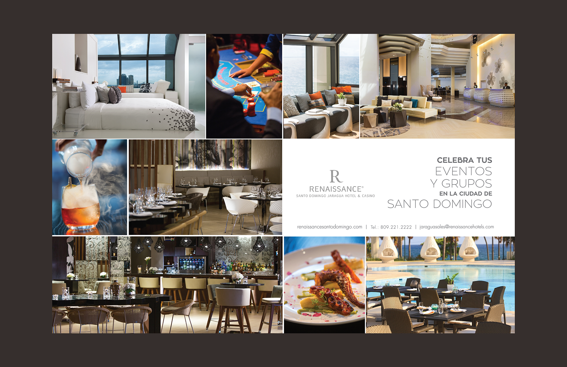 Branding Campaign Relaunch for the "Jaragua" Renaissance Hotel This branding campaign was published as paid advertising in the esteemed magazines: “A La Moda,” “Ritmo Social,” and “Ritmo Platinum,” all published by Editora Listín Diario. The campaign was launched in Santo Domingo, Dominican Republic, in 2016.